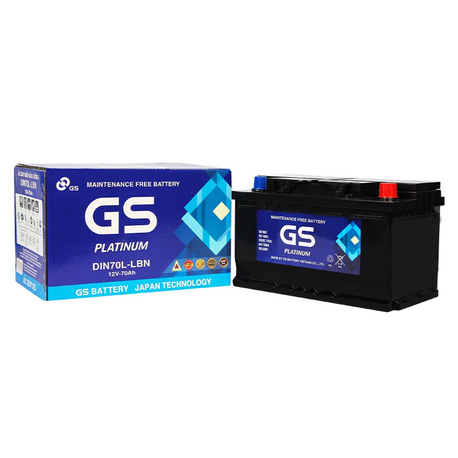 – Ắc quy GS DIN70L/LBN ( DIN70LBN , DIN LB3 , LBN3 ) 12V-70AH còn gọi là ắc quy MF – Pin miễn phí bảo dưỡng , khô , Canxi , kín khí thuộc dòng sản phẩm GS Platinum Maintenanece Free Battery .